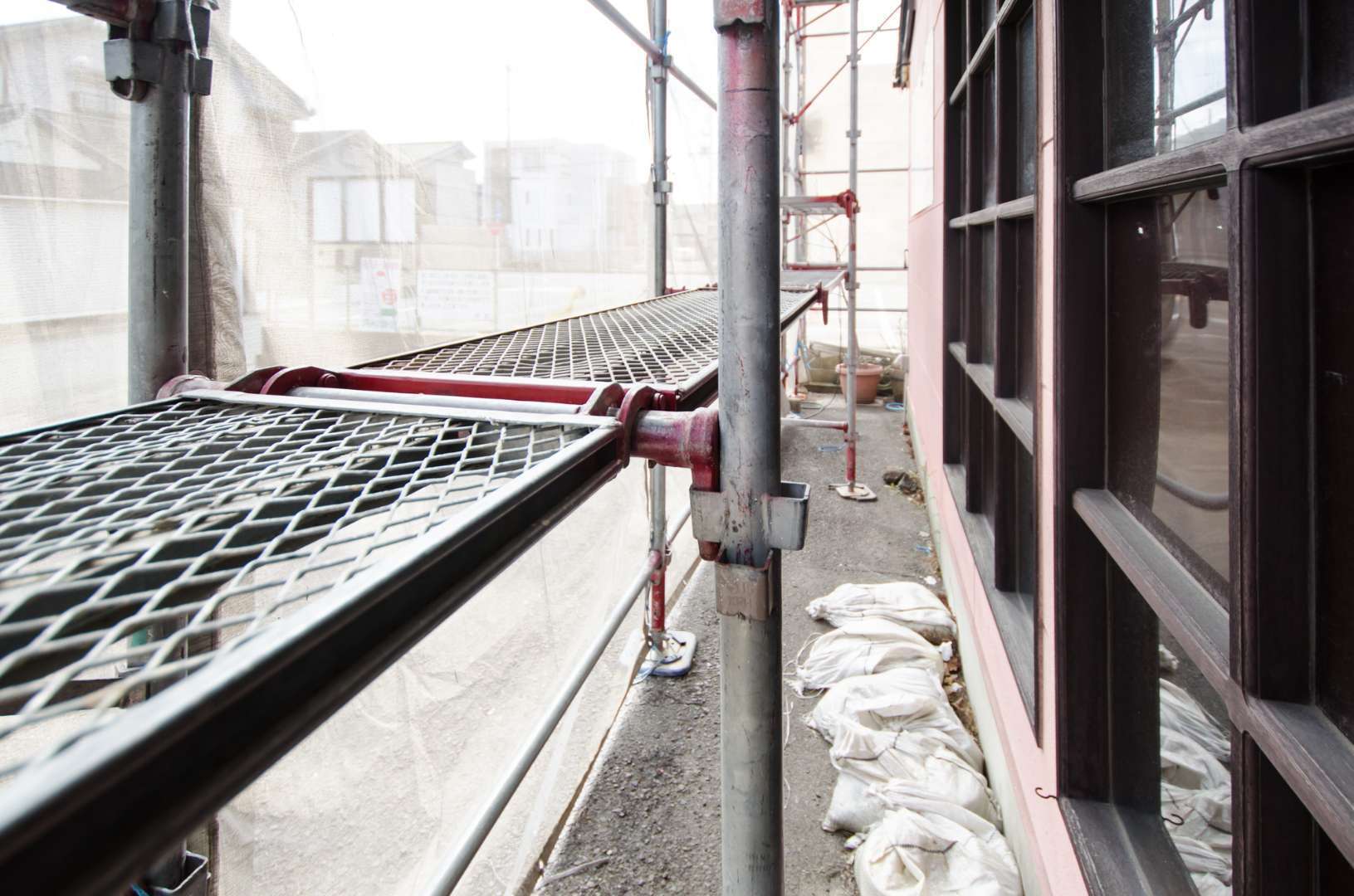 例えば、ベランダや出窓を避けて足場を組んだ結果、建物(躯体)との間に30cmほどの隙間ができてしまうことがあります。30cmもあれば、人が足を滑らせて転落するには十分な広さです。